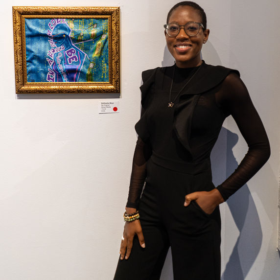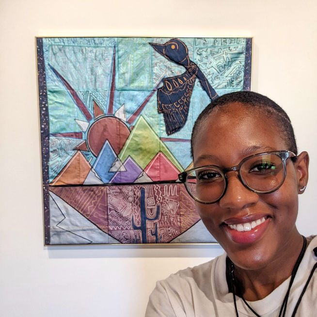 In this gallery my 40x40 fabric design, "Sun Rays and Wings," was featured. Crafted with repurposed denim, this textile art piece supports my business's spirit of sustainable art ecosystems. My textile artistic designs are hand-sketched and painted using non-toxic fabric acrylics.
